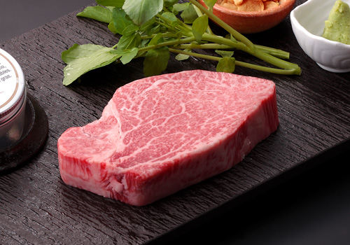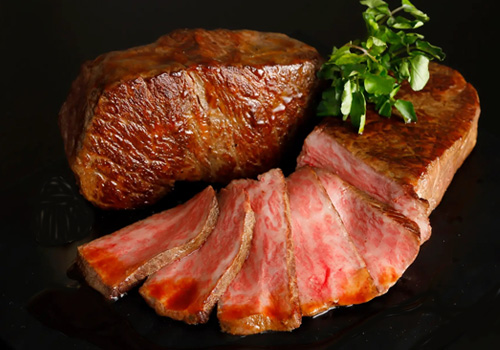 脂肪と赤身のバランスが絶妙で、霜降りが美しく入ったA5ランクのヒレは、まさに極上の味わい。あっさりなのにとろける味わいで、赤身のほんのりとしたクセのない甘みも感じられる、まさに非の打ち所がないヒレステーキです。