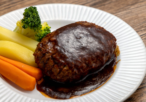 豊かな自然で育まれたサステナブル和牛熟を100%使用した、当社オリジナルの煮込みハンバーグが誕生しました。一般的なハンバーグよりも肉の食感をダイレクトに感じられるよう、あえて固めにし食べ応えのある一品に仕上げました。口に入れた瞬間広がる肉の旨みと、噛みしめるほどに深まる濃厚な肉の味わいは、まさにお肉を食べているような贅沢なひとときを約束します。