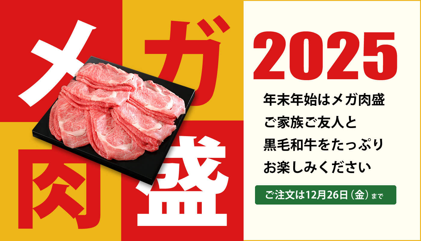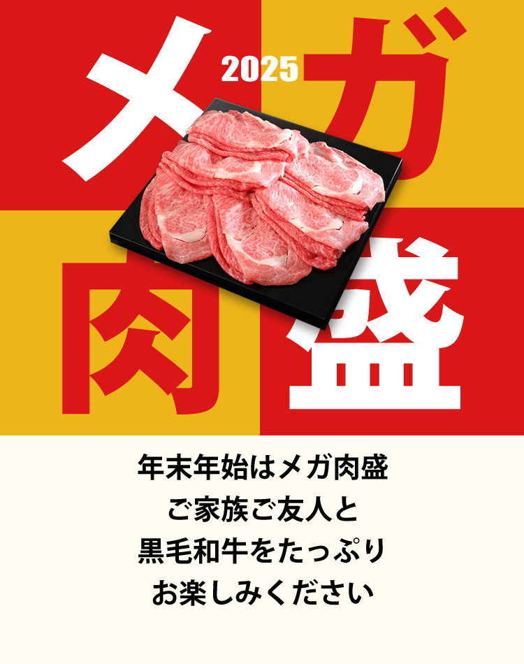 年末年始恒例となりましたメガ肉盛。「すき焼き」「焼肉」「ステーキ」などをメガ盛りにしてお届け。個数限定・割引価格でのご奉仕です。年末年始にご家族・ご友人と黒毛和牛をたっぷりとお楽しみください。