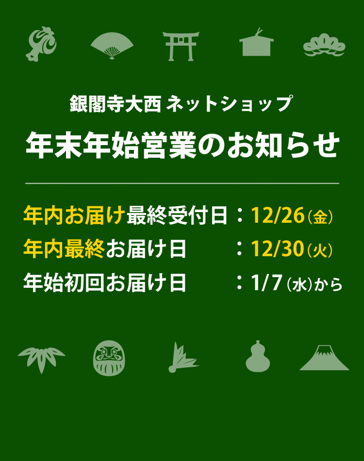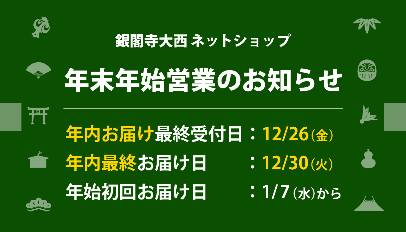 平素は銀閣寺大西並びに商品をご愛顧賜りまして誠にありがとうございます。公式通販サイトの年末年始営業時間につきましてお知らせします。年内のご注文は12月26日(金)までとなります。その他、詳細は下記からご確認お願い致します。