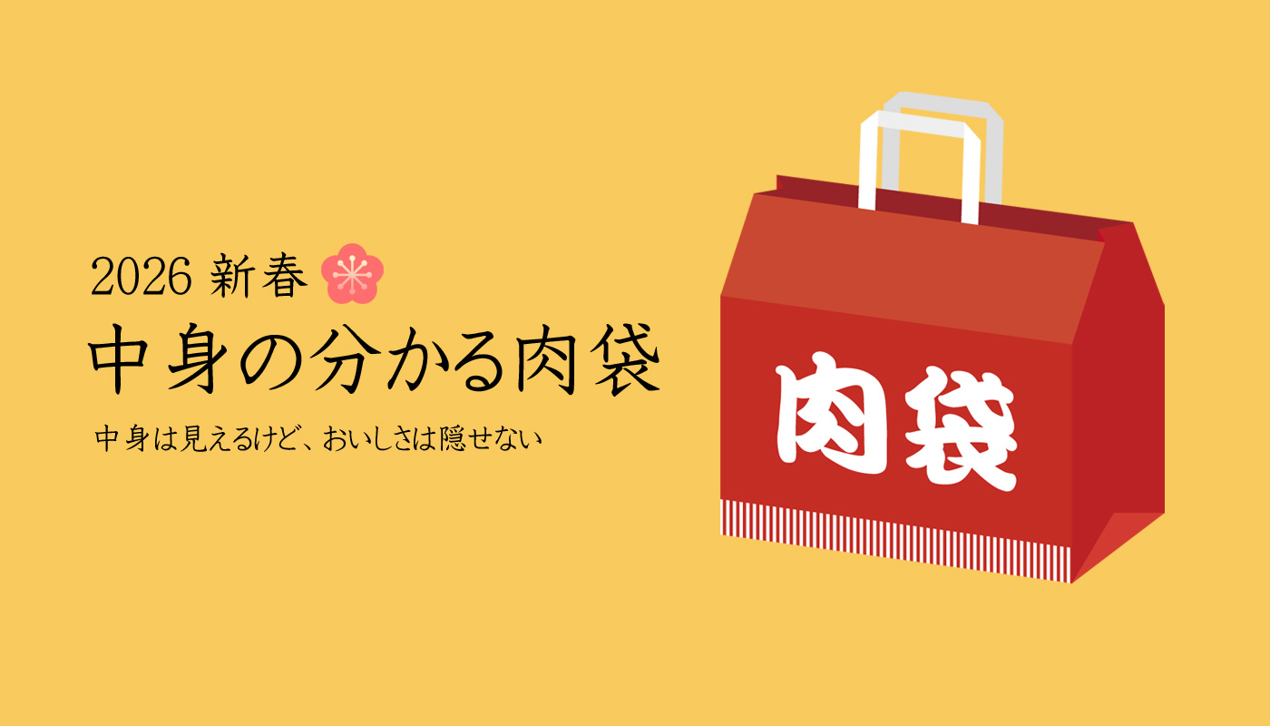 毎年人気の新春特別企画「2026新春 中身の分かる肉袋」の販売を開始しました。精肉から人気の加工品を選りすぐった総重量1.65kgの大変食べ応えのあるセット内容です。限定35セット。是非ともお楽しみください。
