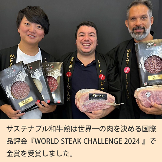 贈る側としても自信を持って手渡せるよう、背景にも徹底的にこだわりました。使用しているのは、2024年・2025年ワールド・ステーキ・チャレンジでも高く評価された「サステナブル和牛 熟」。母牛を再び慈しみ育て直すという、地球にも優しい理念(ストーリー)から生まれた和牛です。